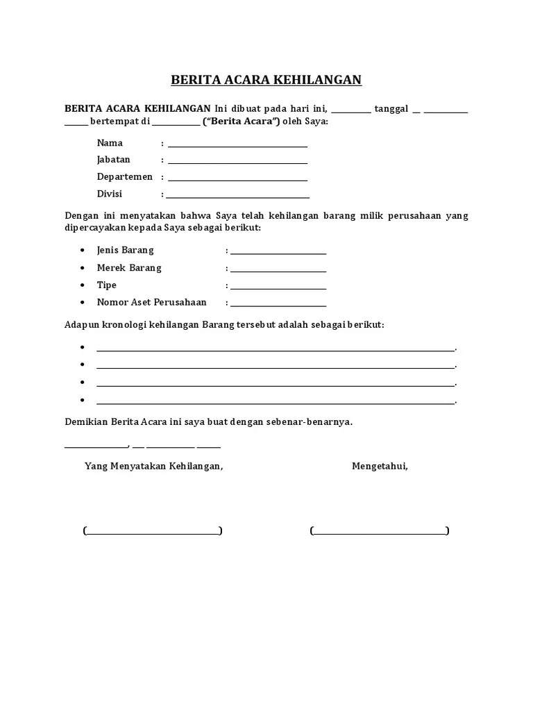 Contoh Berita Acara Kehilangan / Format Berita Acara Kehilangan Dokumen K3 Manajemen K3 Umum / Kronologis kehilangan dokumen (bila ada).